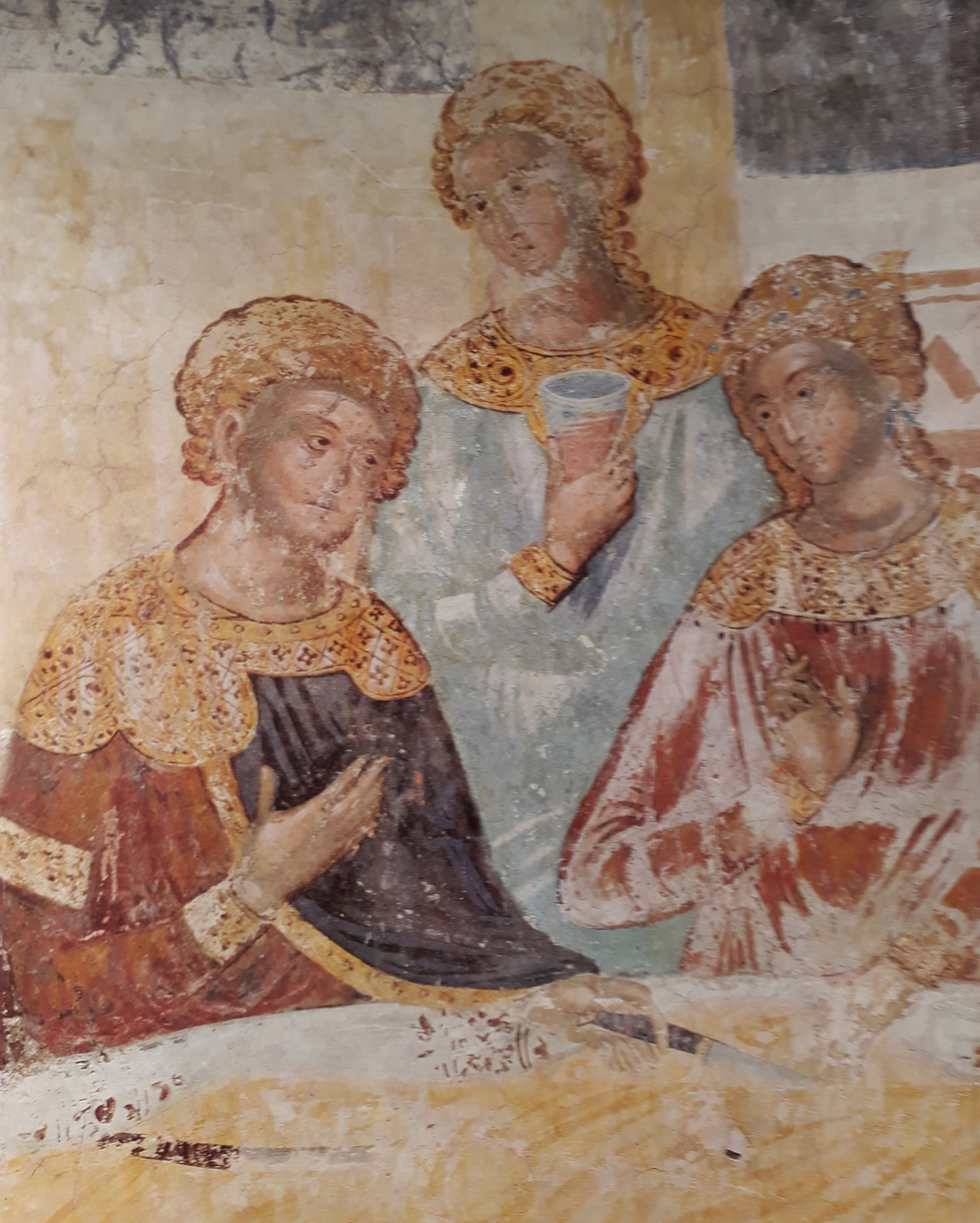 « L’Eau et le vin » relève de cette dernière catégorie. Son titre fait référence à la fresque « Les Noces de Cana » du monastère serbe Kalenitch, qui dépeint le premier miracle accompli par le Christ – la transformation de l’eau en vin. L’art du monastère Kalenitch est représentatif de l’ « École de Morava » (voir le texte relatif à «Bleu et or»). La disposition des trois personnages centraux et le raffinement du coloris rappellent l’icône de la Trinité d’Andreï Roublev. La tendresse et la délicatesse du sfumato de la fresque serbe rappellent la douceur des peintures de la Renaissance italienne.