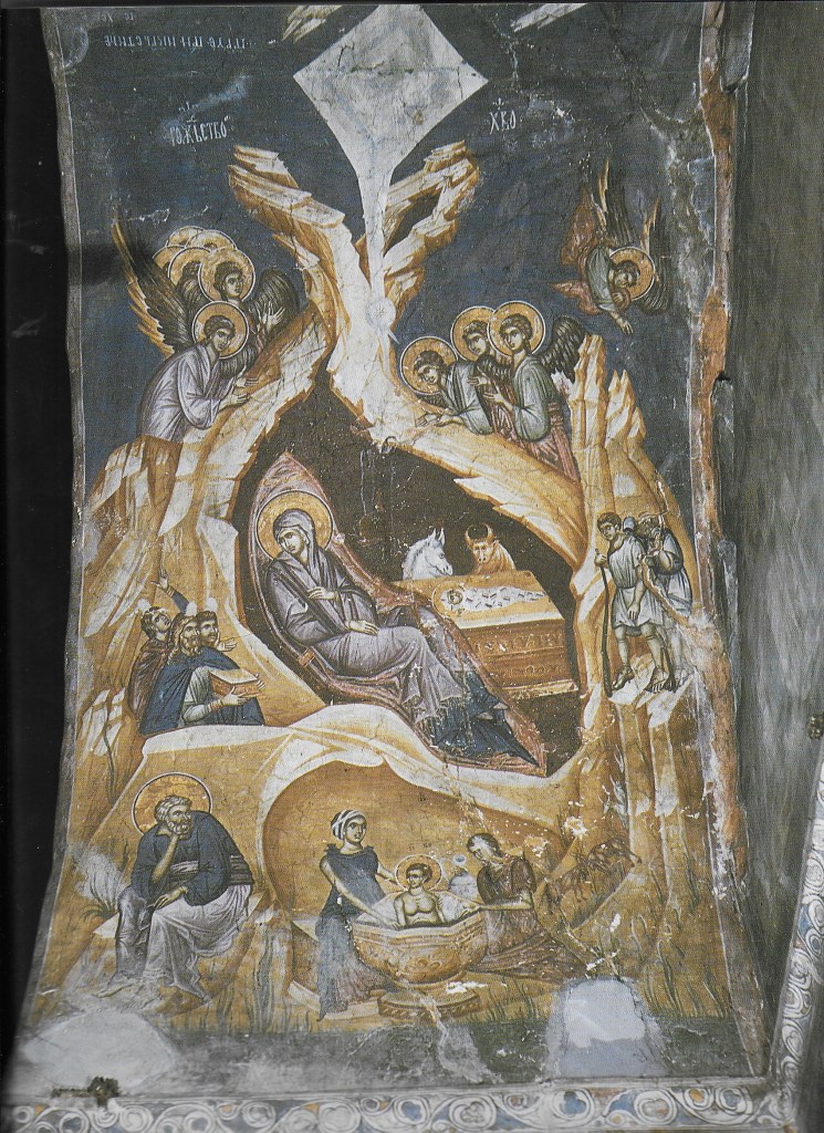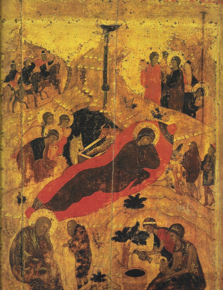 L’icône de la Nativité parvient à raconter une histoire qui se déroule sur plusieurs jours, sur une seule image. Au centre, Marie avec l’enfant Jésus enveloppé dans les langes ; en haut, les anges annonçant la Bonne Nouvelle ; sur le bord gauche, les rois-mages apportant les offrandes au Messie ; sur le bord droit les bergers, prévenus par les anges de la Bonne Nouvelle, arrivant pour s’incliner devant le nouveau-né ; en bas à gauche – Joseph assis, le regard perdu, la tête reposant sur une main, en proie à des doutes quant à la virginité de Marie ; à droite, l’enfant Jésus en train de prendre son premier bain.