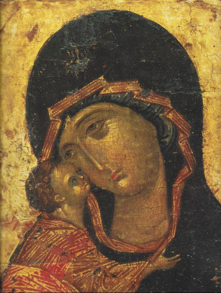 Dans la typologie des icônes de la Vierge à l’enfant, la plus courante est celle où la mère et l’enfant sont joue contre joue, dans un rapport de tendresse. On y retrouve les couleurs chaudes et « terriennes » des icônes de Roublev, toutes les nuances de l’ocre, de l’ocre-jaune, de l’ocre-rouge, de l’or … et cette mystérieuse couleur du vêtement de Marie, un noir, qui – « éclairé » par les couleurs environnantes – prend leurs teintes. Le regard pensif et « absent » de Marie, que l’on remarque sur toutes les icônes où elle est représentée, est à rapprocher de la phrase de Luc : « … elle retenait tous ces événements en les interprétant dans son cœur ».